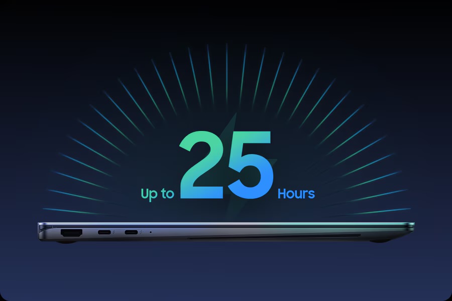 Charge once, stay productive all day with the long-lasting battery of Galaxy Book5 Pro 16", supporting up to 25 hours of video runtime. To power up, plug in the compact charger to get up to 35% in just about 30 minutes using fast charging.
